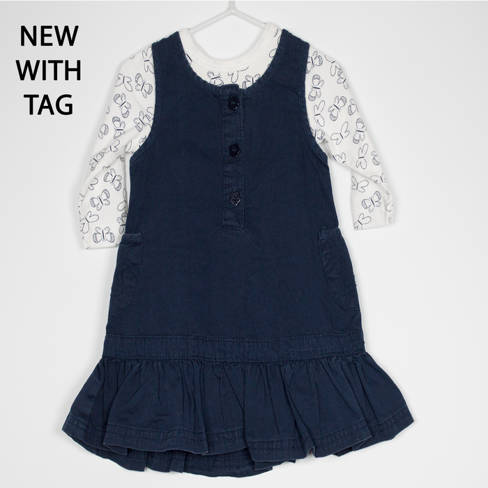Description: Butterfy print long sleeve top with cotton pinafore style dress, 3 flower shaped buttons to front and pockets detail.