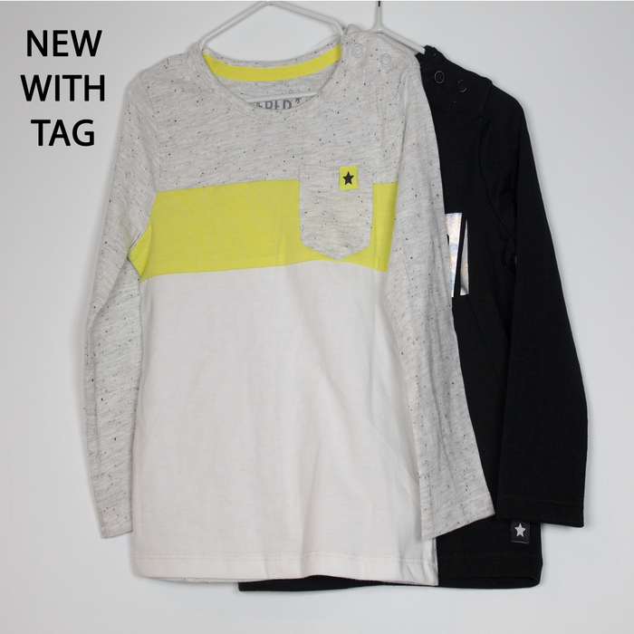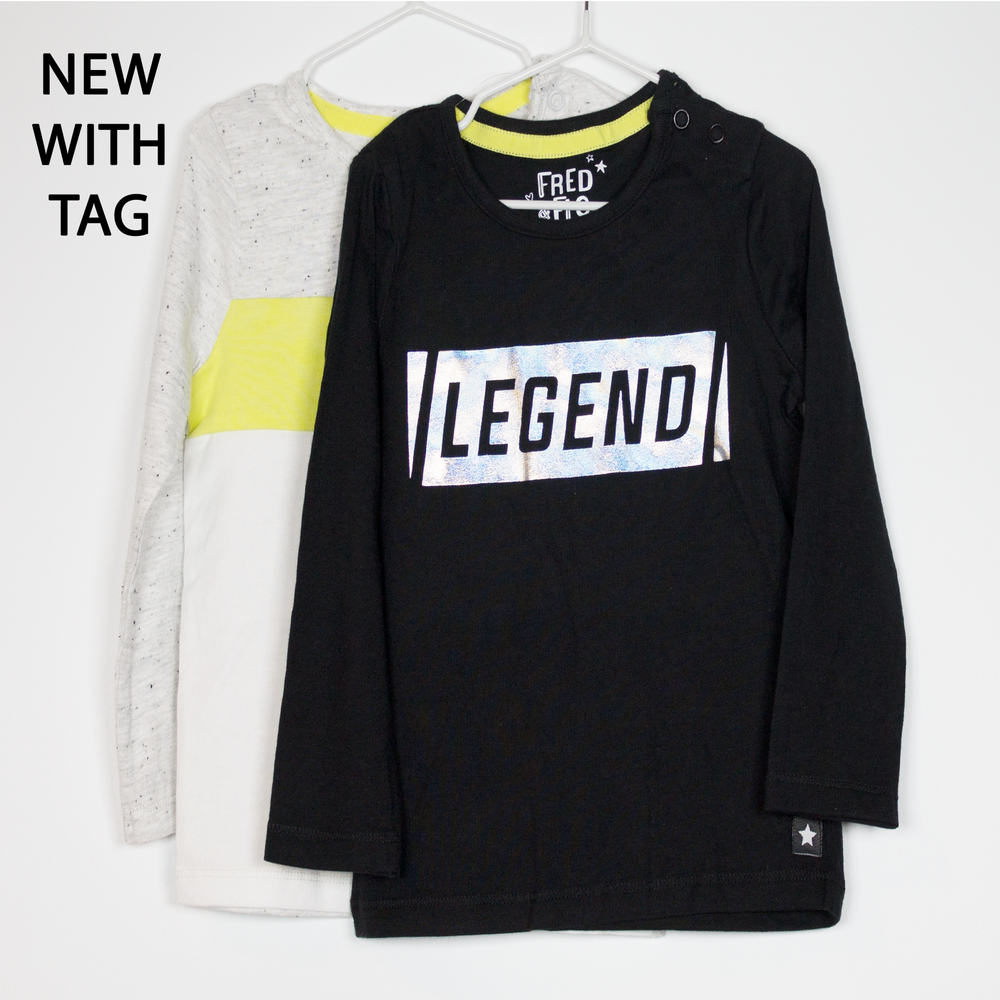 Description: 2 long sleeve tops, metallic sheen 'Legend', and stripes of colour.
