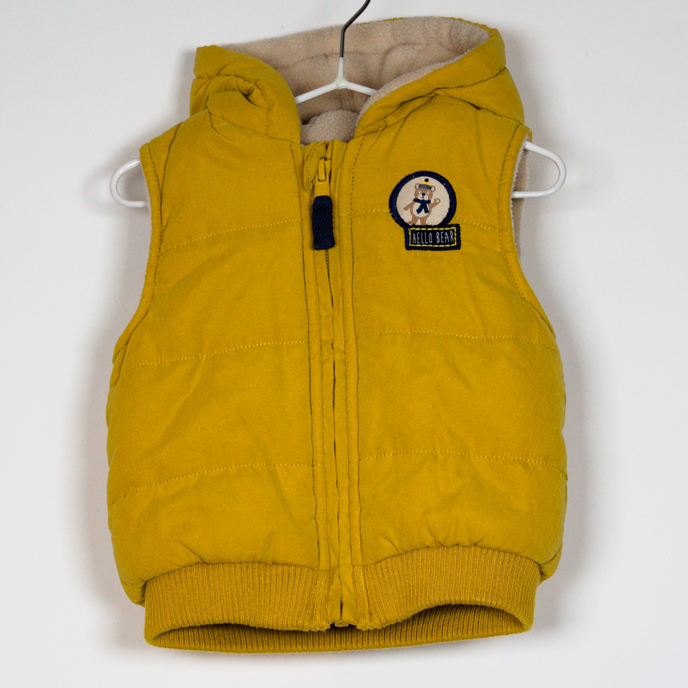 Description: Padded soft fabric body warmer. Fleece lined with ears to hood and zip to close.