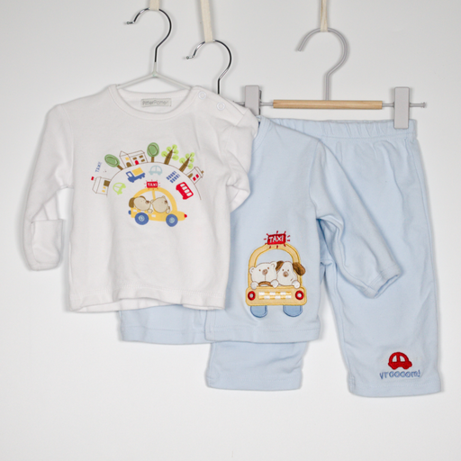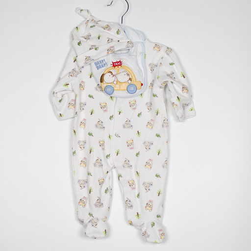 Pitter PatterDetails Description: Sleepsuit, top knot hat, velcro close bib, pants and cardigan set . Colour: White, blue. Material: Cotton. Size on Label 6-9M ...