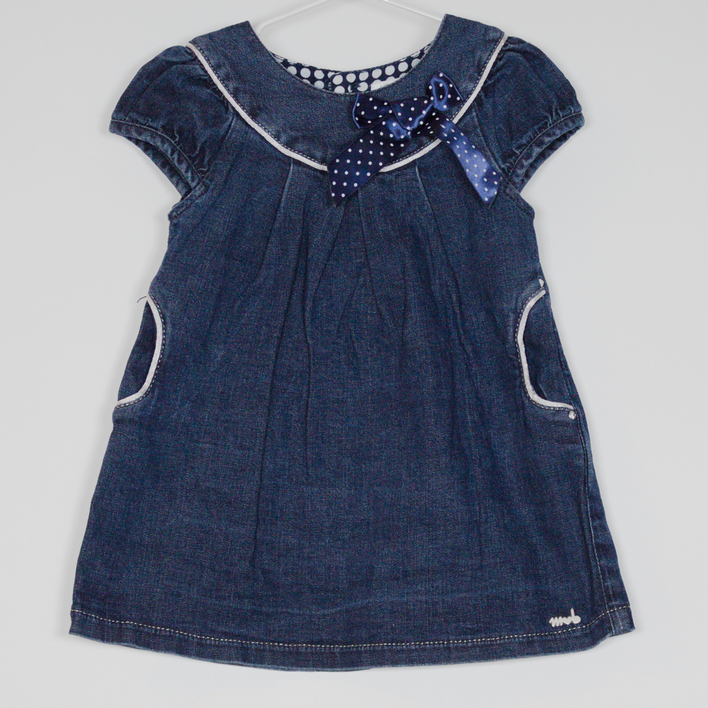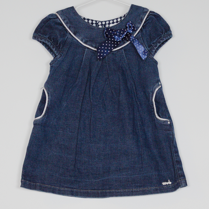 Description: 3 silver buttons to back, polka dot ribbon bow denim dress with pockets and silver piping trim.