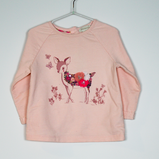 MonsoonDetails Description: 3D flower detail on deer graphic long sleeve top, buttons down the back. Colour: Pink. Material: Cotton, polyester. Size on La...