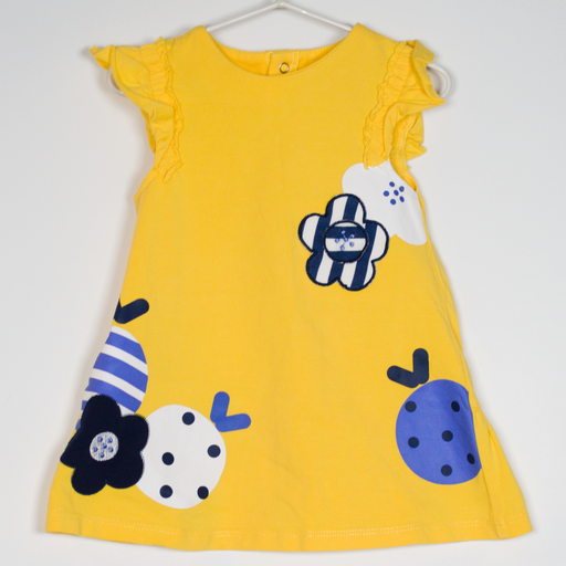 MayoralDetails Description: Printed dress with one applique flower, poppers to most of length of back,. Colour: Yellow. Material: Cotton, elastane. Size o...