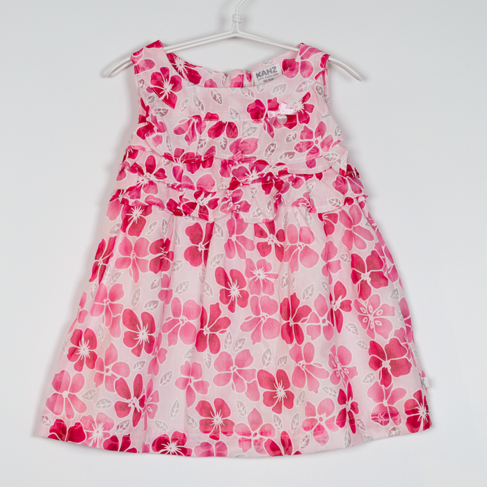 Description: Light lined dress, ruffles to chest, sheer flowers, 3/4 zip to back.