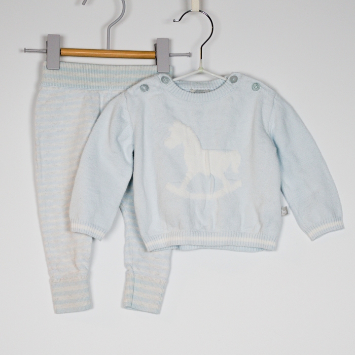 Description: Fine knit cotton and cashmere sweater, 2 buttons to each shoulder, cuffed leggings. Looks to be small fitting.
