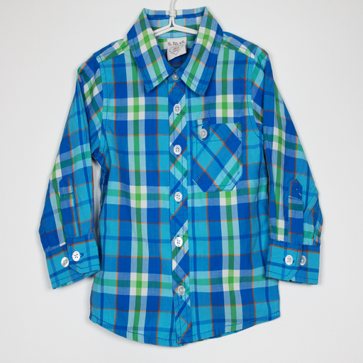 5.10.15Details Description: Cotton shirt with pocket. Colour: Blue, green, white. Material: Cotton. Size on Label 12-18M Condition Great Condition: rarely...