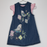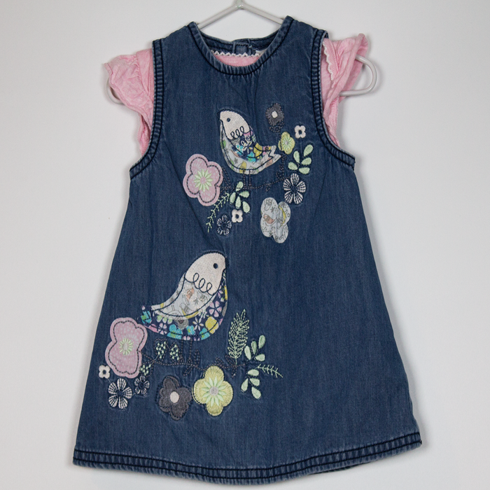Description: Bird and flower appliques, embroidered flowers denim dress, three buttons to back and short sleeve bodysuit.