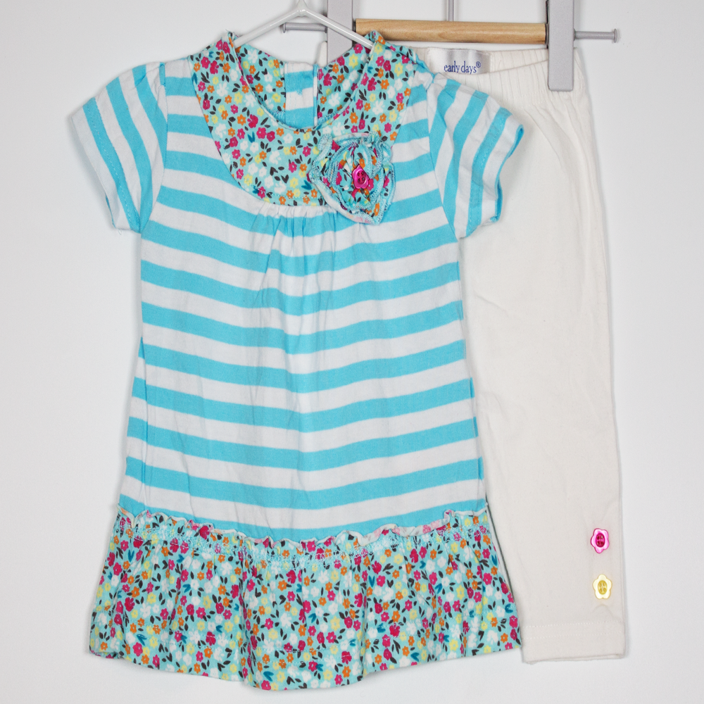 Description: Striped t-shirt with contrasting flower pattern neckline and peplum hem with matching leggings.