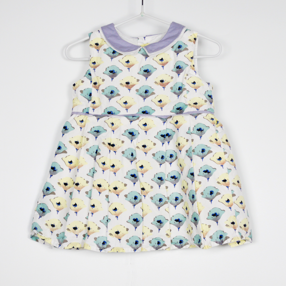 Description: Lined dress with souble collar, buttons all down the back and pleats to the skirt.