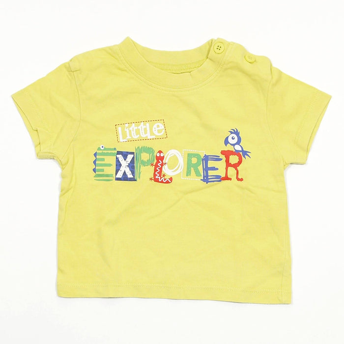 Green T-shirt with a cute baby parrot and camouflaged animal Little Explorer print, by F&F.