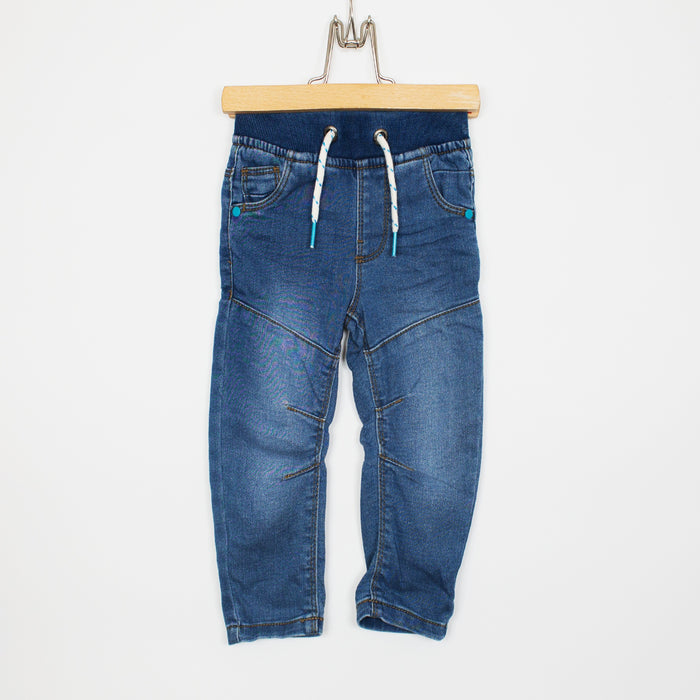Stretch denim, fitted jeans with elasticated waistband and blue and white drawstring by Dunnes