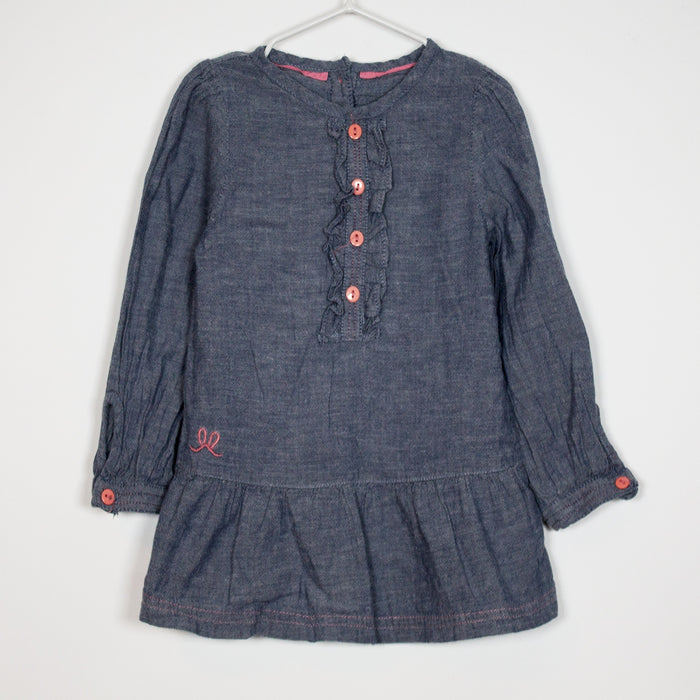 Description: Light weight denim long sleeve top with ruffle detail and contrasting pink buttons.