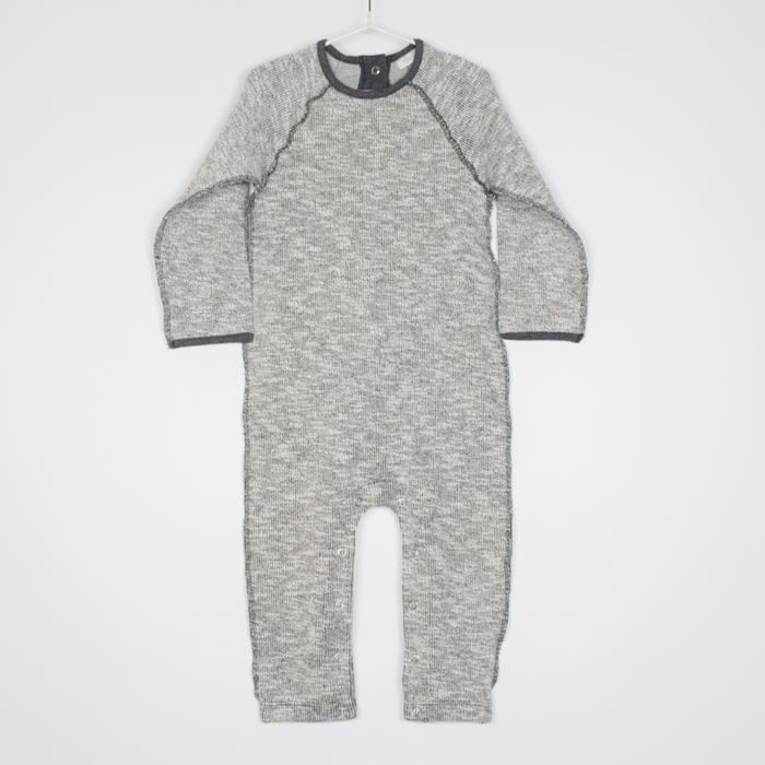 Description: Raw hem detail footless onesie, poppers to inner legs and three poppers to back.