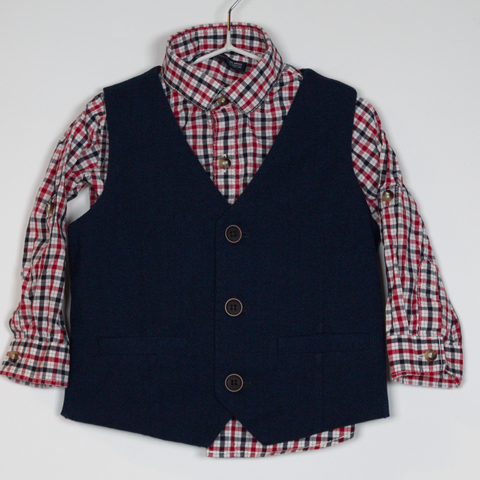 Description: Long sleeve shirt with tab and button to shorten sleeve length. Tailored herringbone waistcoat.