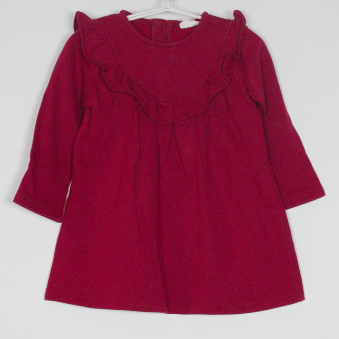Description: A line dress, 3 buttons to back, ruffle detail to front.