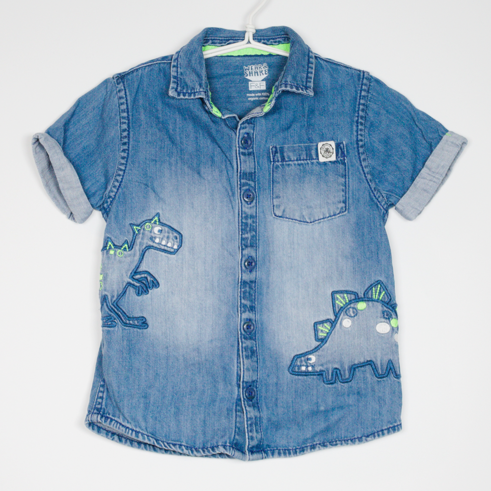 Description: Organic cotton shirt with embroidered dinosaurs.