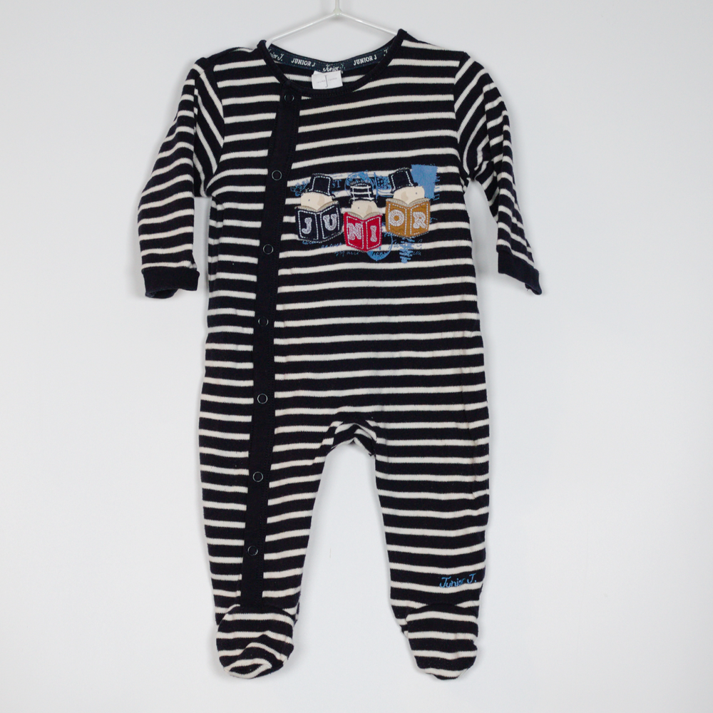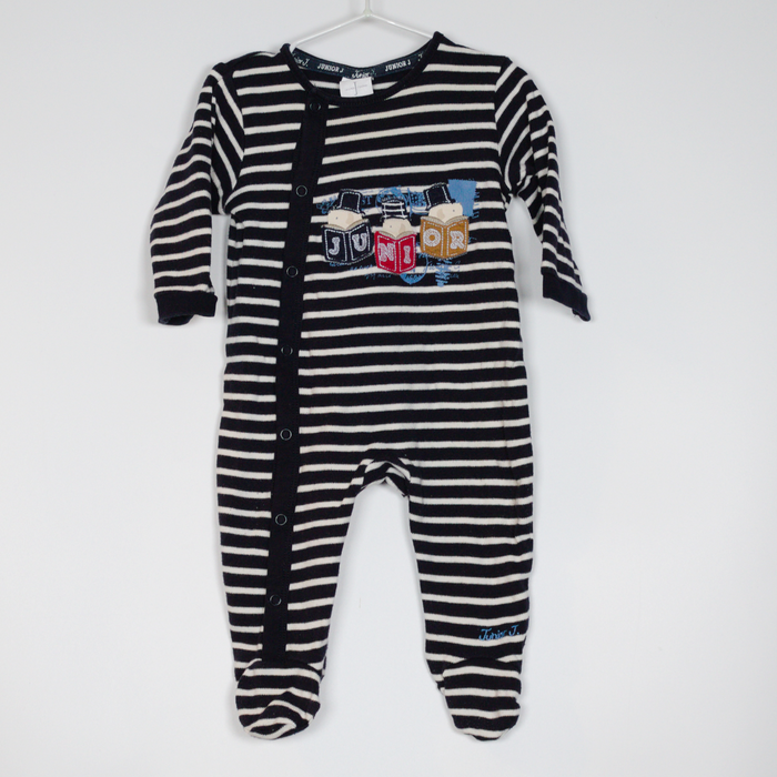 Description: Sleepsuit with asymmetric poppers to close and applique detail.
