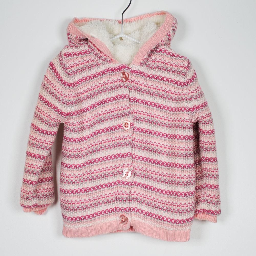 Description: Super warm fleece lined knitted cardigan with hood and heart shaped buttons.
