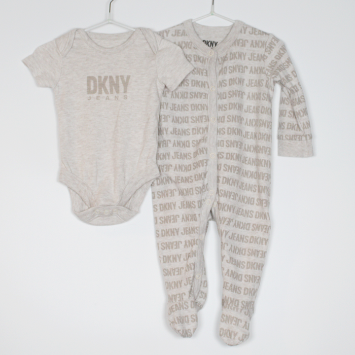 Description: Short sleeve bodysuit and onesie with logo throughout.
