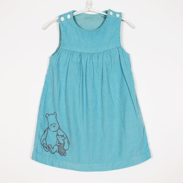 Description: Needle cord dress with embroidered Pooh Bear and Piglet and sweet Pooh Bear popper fastenings to the shoulders.