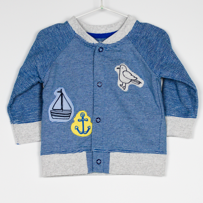 Description: Ribbed collar, cuffs, hem, poppers to close, appliques to front.