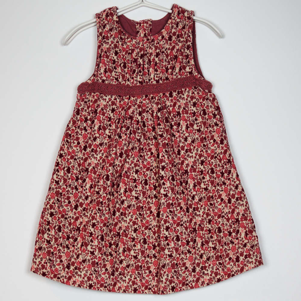 Description: Needlecord lined dress, three buttons to back with lace ribbon and pleating to yoke.