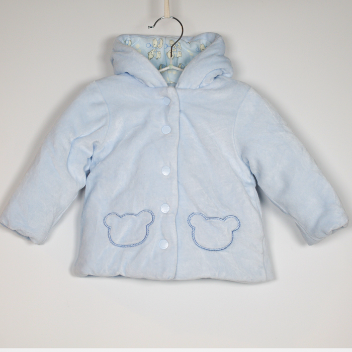 Description: Lined, padded verlour jacket, bear shaped pockets, poppers to close, sweet teddy bear print lining to hood and sleeves.
