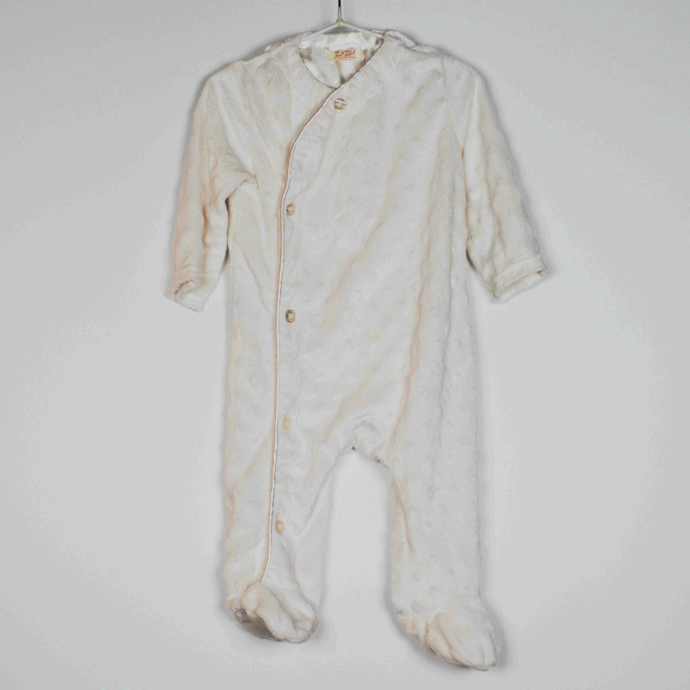 Description: Super soft velour onesie with satin trim and buttons to close.