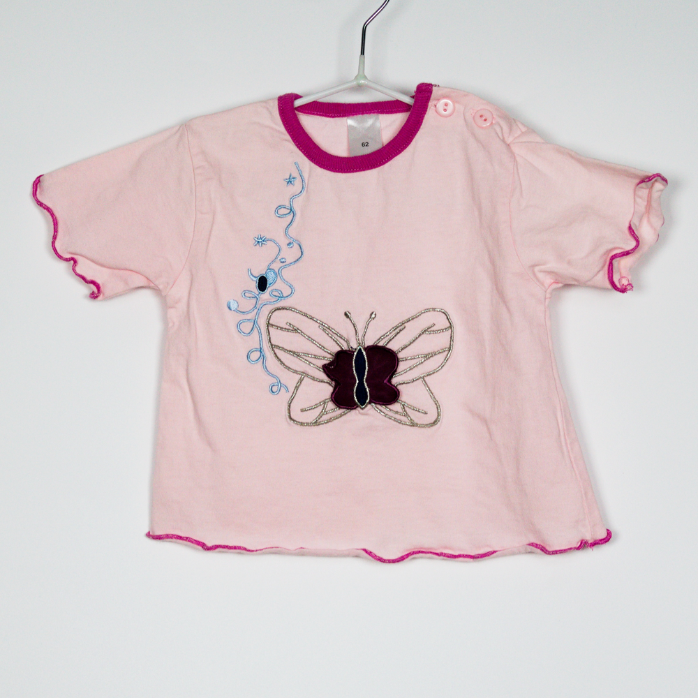 Description: Silver thread embroidered butterfly t-shirt, raw hems, 2 buttons to side of collar.
