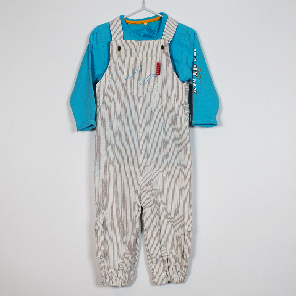Description: Pinstripe light weight dungarees with aqua marine long sleeve top.