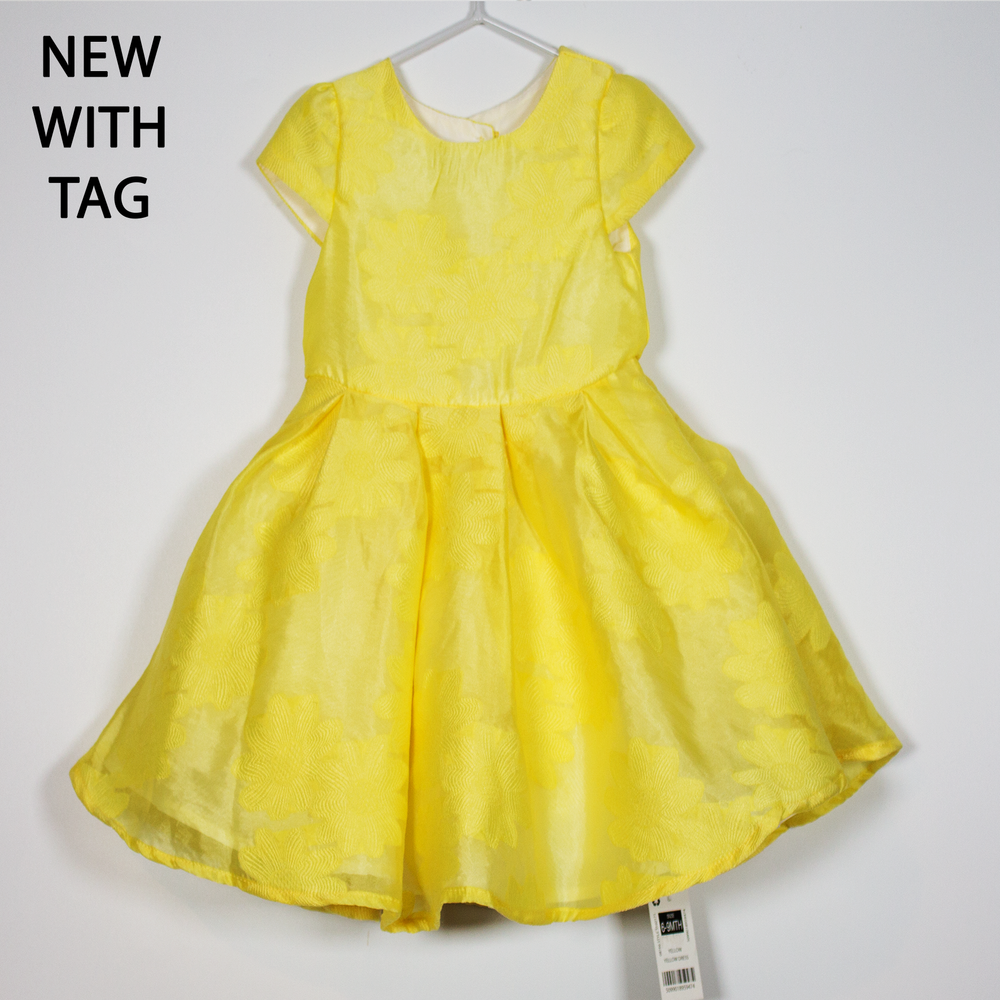 Description: Sunny yellow lined dress with embossed flowers throughout and 2 extra layers to the skirt for volume.