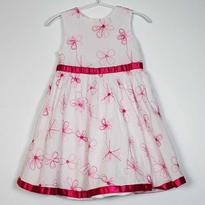 Description: Embroidered pink flowers and ribbon detail lined dress with 3 buttons to back.