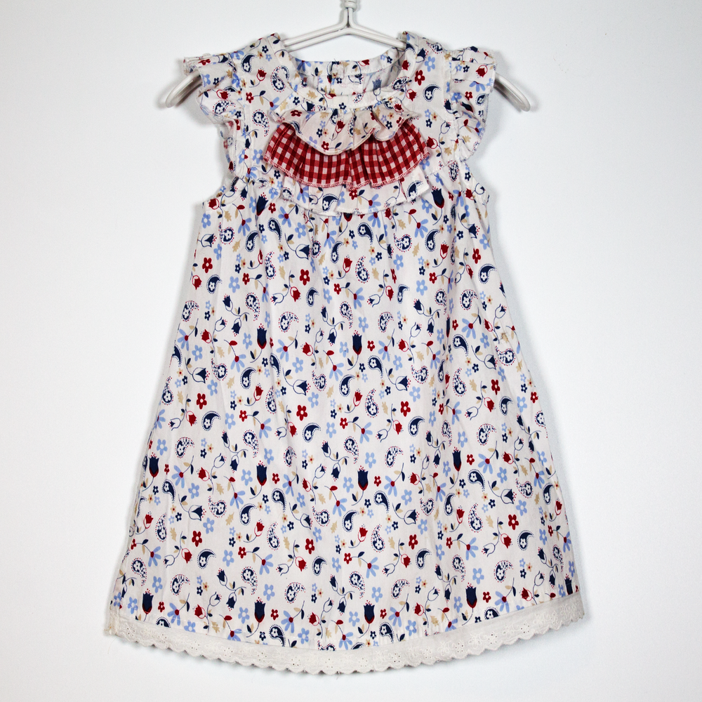 Description: Sweet cotton dress with ruffle detail to yoke and lace hem.
