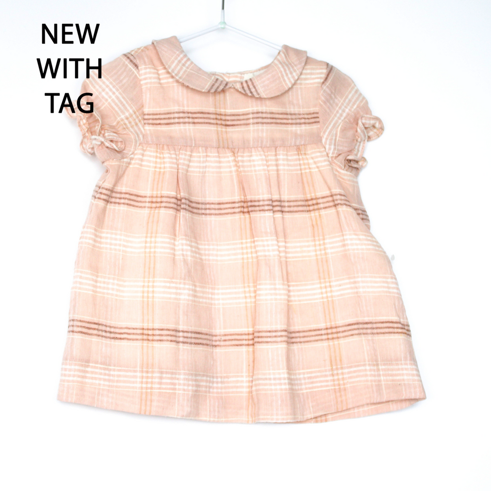 Description: Lined dress, Peter Pan collar, puff sleeves, buttons all down back.