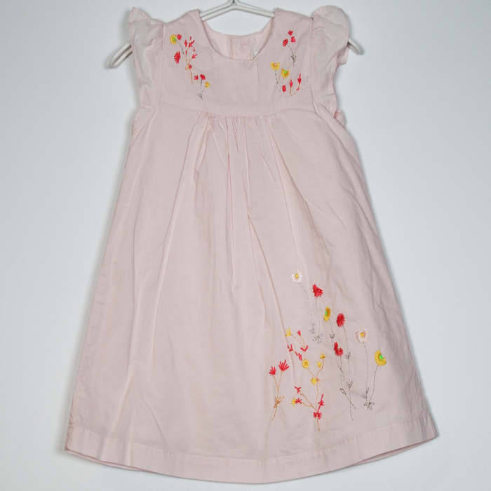 Description: Sweet embroidered flower detail lined summer dress with buttons down the back.