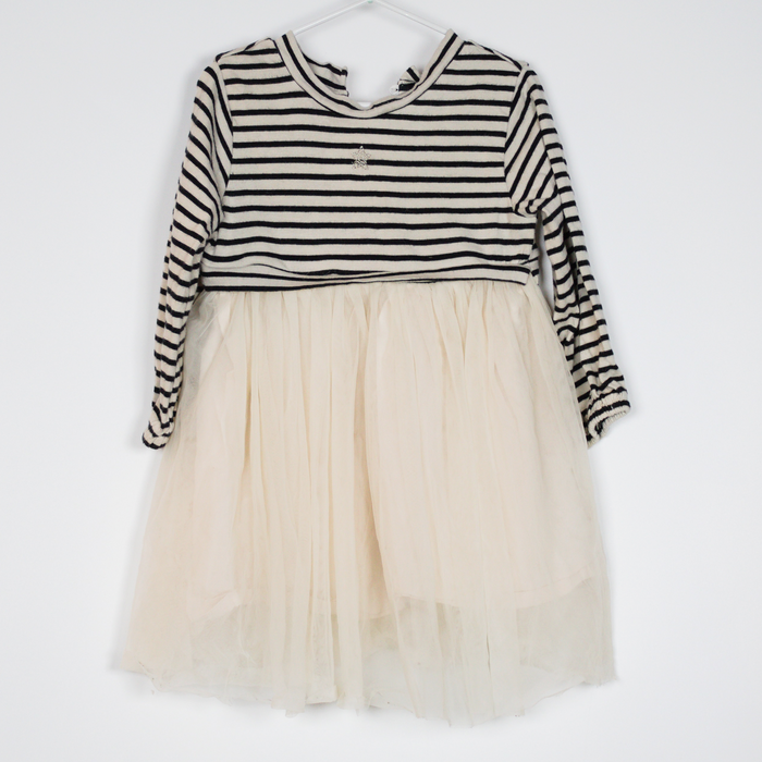 Description: Cotton striped body, button to back, elasticated cuffs, tule layer skirt over cotton lining.