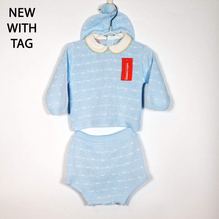 Description: Knitted jumper with Peter Pan collar and buttons down the back, matching nappy cover and hat with pom pom.