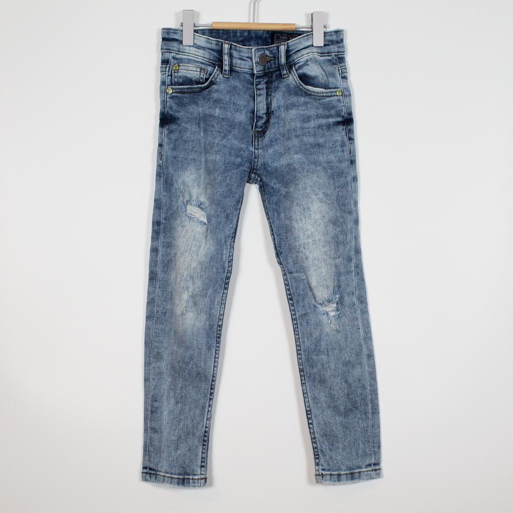 Description: Stone wash denim jeans with stretch with adjustable waist band and ripped knees.