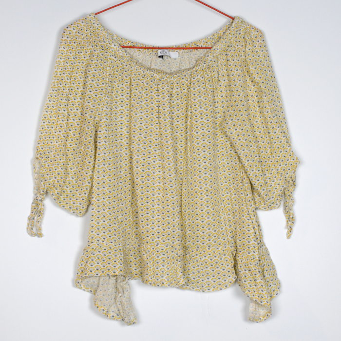 Description: Peplum hem, bardot style neck, ties to cuffs.
