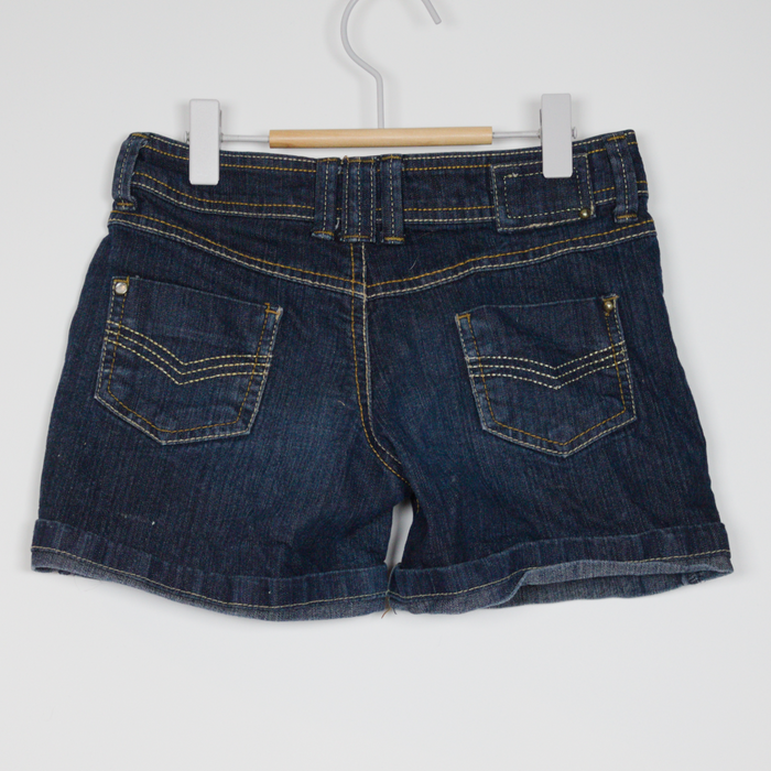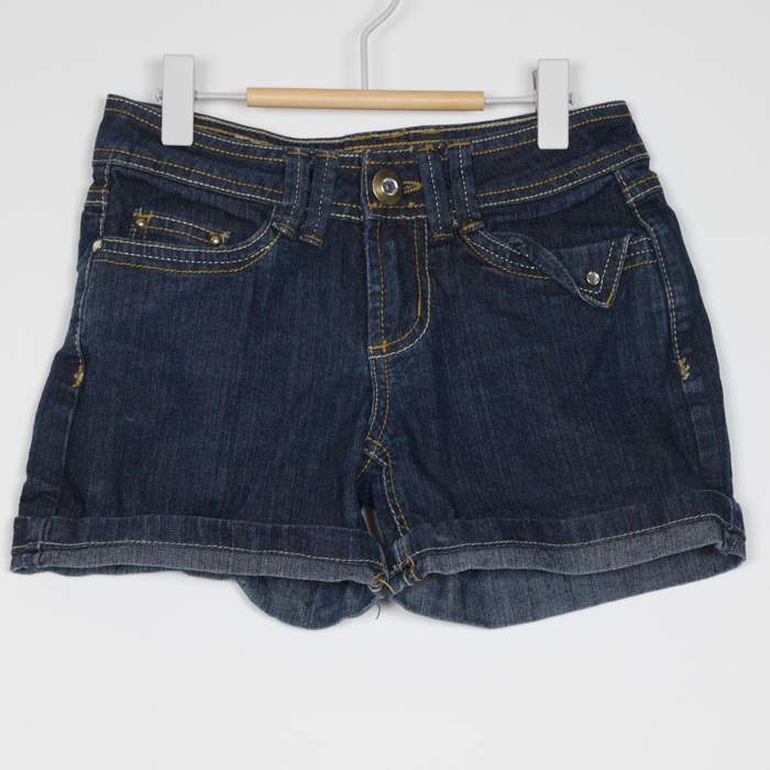 Description: Denim shorts with stretchm turn ups and diamonte detail to button and pocket.