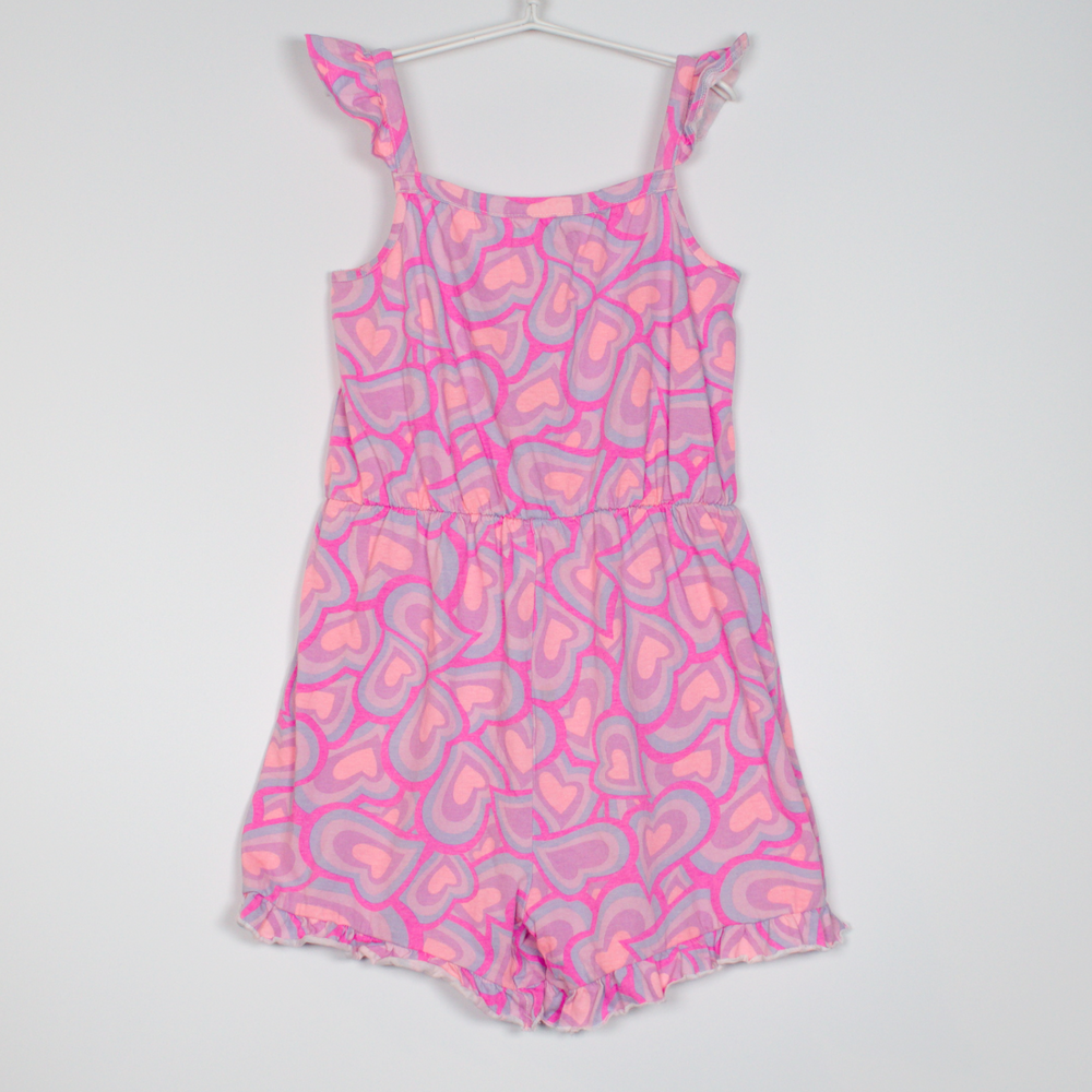 Description: Heart print playsuit, ruffle detail to hems and straps.