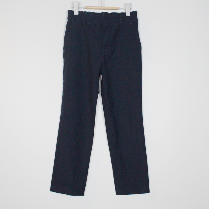 Description: Navy school trousers, adjustable waist band, hook and eyelet closure.