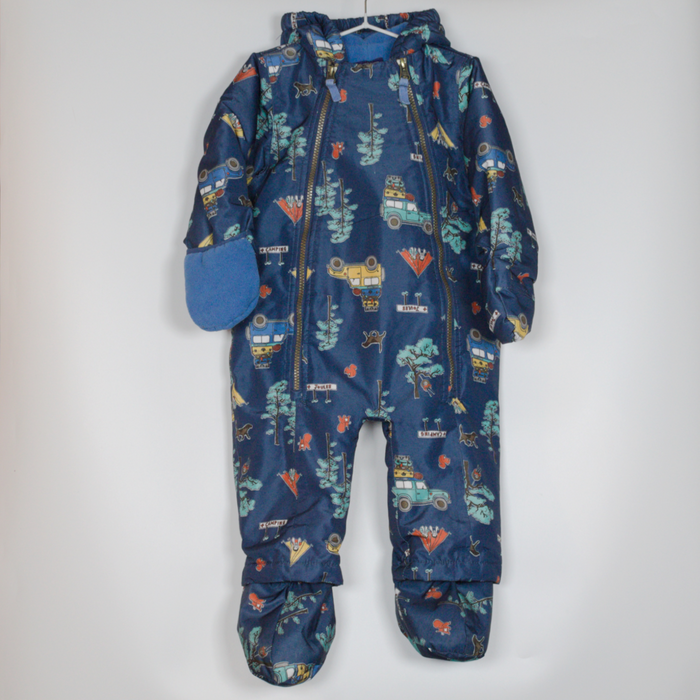 Description: Double zip snowsuit, hood, removable booties, fleece lined, padded, fold over hand covers, PU coated.
