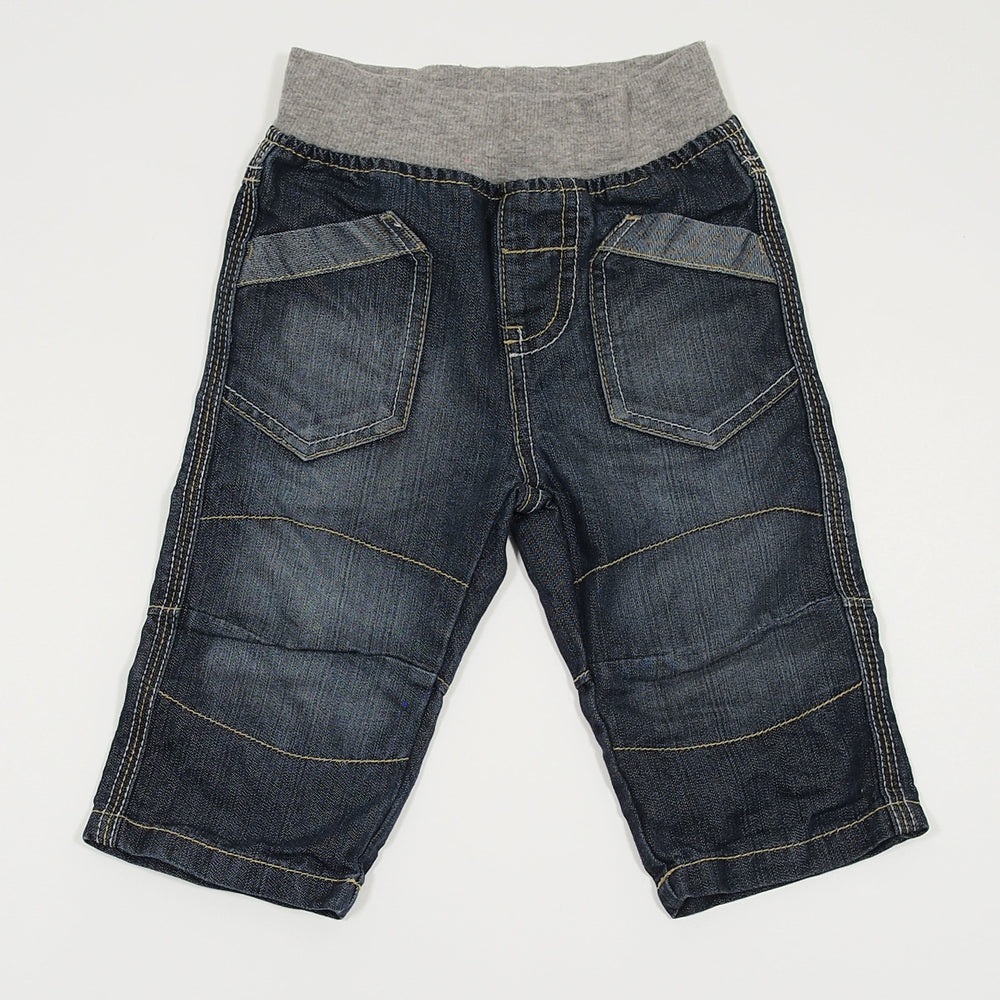 Blue structured denim jeans with a soft stretchy waist, by Lupilu.