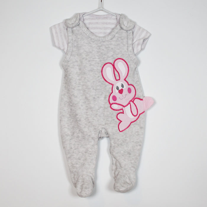 Description: Soft tiny baby dungarees with bunny motif by Ergee with newborn organic cotton short sleeve bodysuit by Lily & Dan.