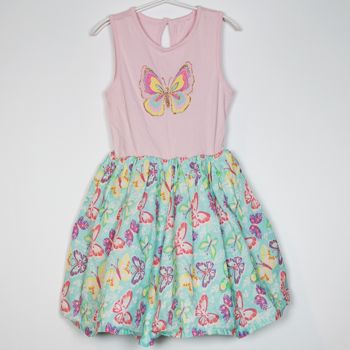 Description: Glitter detail butterfly to bodice and crisp cotton, lined skirt.